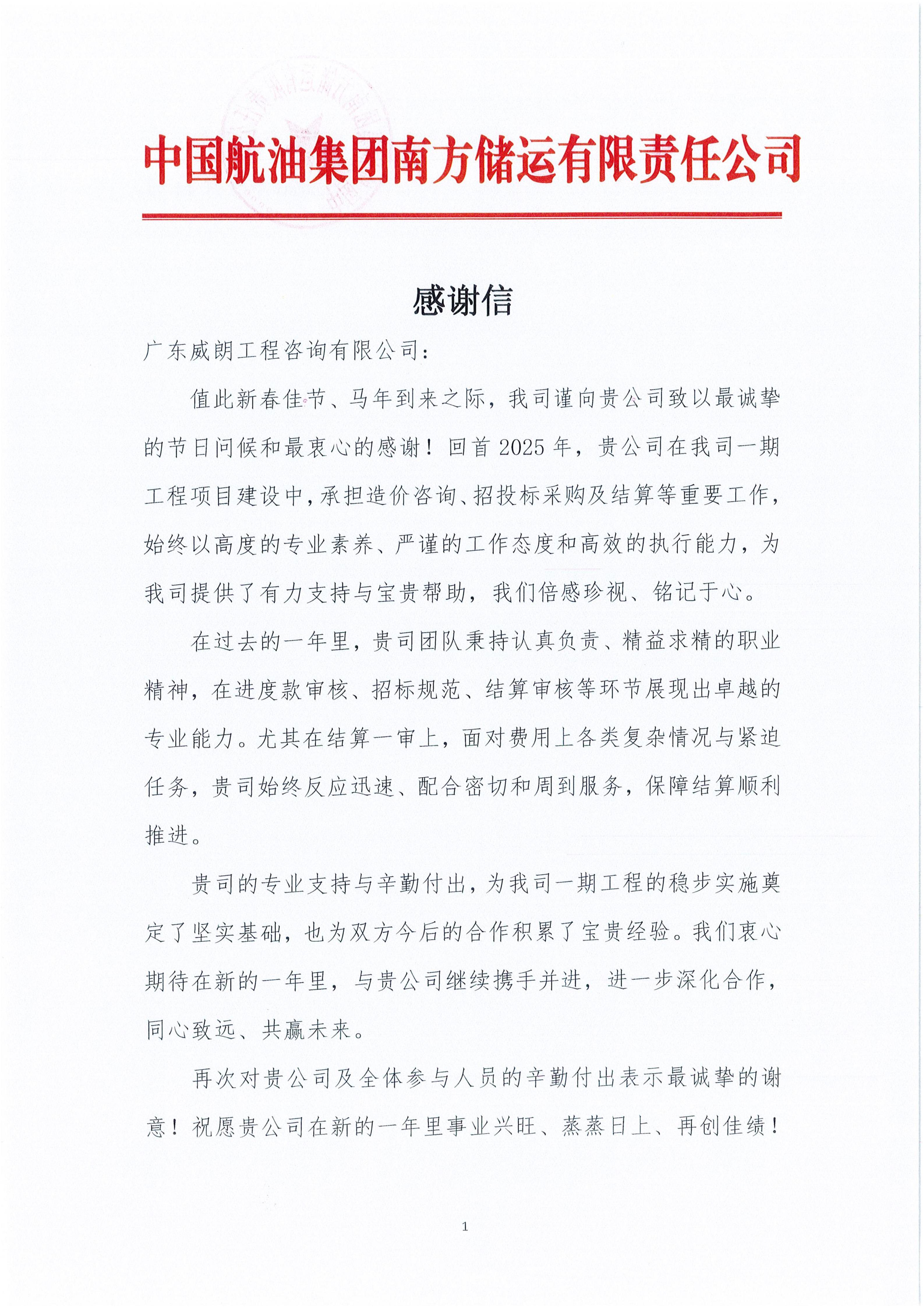 公司中航油湛江基地项目部造价咨询团队始终秉持的认真负责、精益求精的职业精神,在进度款审核、招标规范、结算审核等环节展现出卓越的专业能力;尤其在结算一审上,面对费用上各类复杂情况与紧迫任务,始终反应迅速、配合密切和周到服务,保障结算任务顺利推进,获得了客户的认可与感谢。
